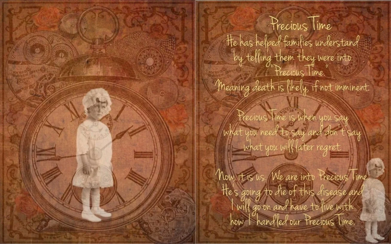This was one of the first pages I created. I am not sure Bob ever told a family they were “into Precious Time 22 months prior to the death, which is when I created this page. Still, when we first got Bob’s diagnosis, we thought he had about three months. And, I had heard him talk about Precious Time so much that I just went right into it. No regrets. Anyway, as one of my early digital collages, I can see some mistakes, yet I still love this art. The child shown here is my maternal grandmother circa 1917. She and I were very close and A LOT alike in many ways. It’s been nearly 14 years since her death at age 95 and I think I am still becoming more like her every day.