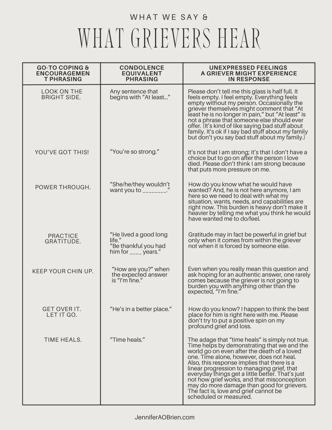 Please strike these responses from your grief and condolences lexicon. I will share more thoughts on alternatives to these in a future newsletter. Please respond with your alternatives if you like.